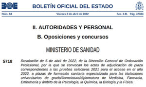 Publicada al BOE Núm. 84, de divendres 8 d’abril de 2022, la Resolució de 5 d’abril de 2022, de la Direcció General d’Ordenació Professional del Ministeri de Sanitat, per la qual es convoquen els actes d’adjudicació de plaça corresponents a les proves selectives 2021 per a l’accés l’any 2022 a places de Formació Sanitària Especialitzada (FSE) per a les titulacions universitàries de grau en Infermeria.