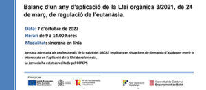 El primer any d’aplicació de la Llei orgànica 3/2021, de 24 de març, de regulació de l’eutanàsia serà l’objecte de debat de la jornada organitzada pel Departament del Salut, aquest divendres 7 de maig, entre les 9 i les 14 hores.