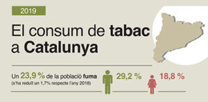Segons l’Enquesta de salut de Catalunya 2019, un 23,9% de la població adulta fuma enfront del 25,6% del 2018