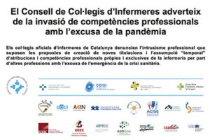 Els col·legis oficials d’infermeres de Catalunya denuncien l’intrusisme professional que suposen les propostes de creació de noves titulacions i l’assumpció “temporal” d’atribucions i competències professionals pròpies i exclusives de la infermeria per part d’altres professions amb l’excusa de l’emergència de la crisi sanitària.