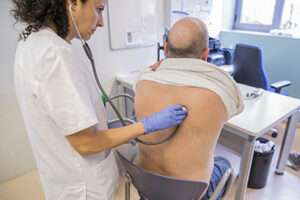 Foto: Infermera d’atenció primària realitza una auscultació pulmonar © Ariadna Creus i Àngel García (Banc Imatges Infermeres)