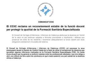 El Consell de Col·legis d’Infermeres i Infermers de Catalunya (CCIIC) vol expressar la seva preocupació davant la decisió de l’Institut Català de la Salut de retirar el complement de docència que percebien algunes infermeres implicades en la Formació Sanitària Especialitzada (FSE). Es tracta d’una situació que ha generat un profund malestar entre les professionals afectades i que ens obliga a obrir una reflexió de fons sobre les condicions en què s’està sostenint una part cabdal de la docència clínica a Catalunya.