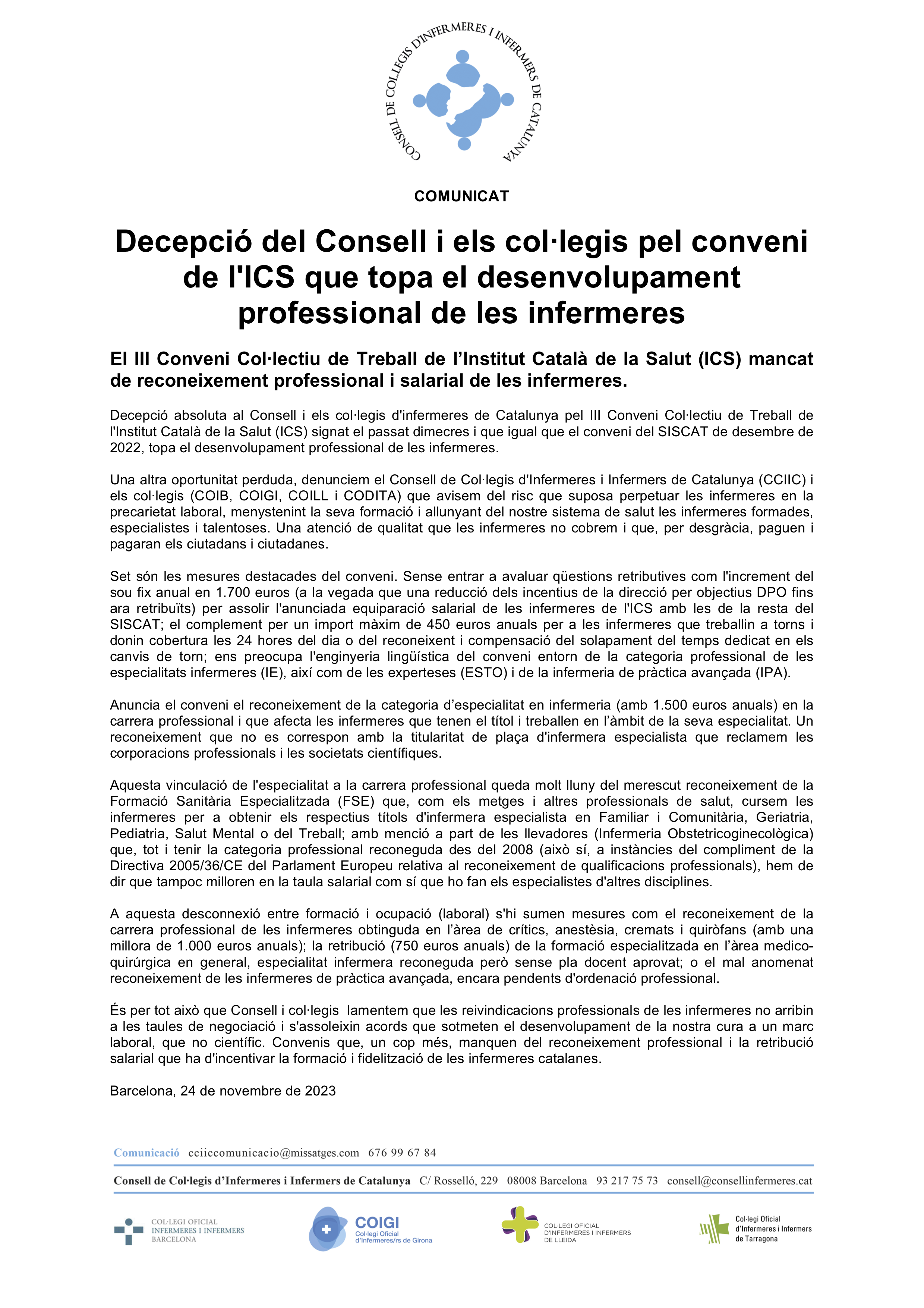 Decepció absoluta al Consell i els col·legis d’infermeres de Catalunya pel III Conveni Col·lectiu de Treball de l’Institut Català de la Salut (ICS) signat el passat dimecres i que igual que el conveni del SISCAT de desembre de 2022, topa el desenvolupament professional de les infermeres.