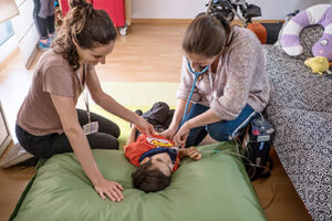 Foto Infermeres de cures pal·liatives examinen un infant en una visita a domicili © Ariadna Creus i Àngel García (Banc Imatges Infermeres)