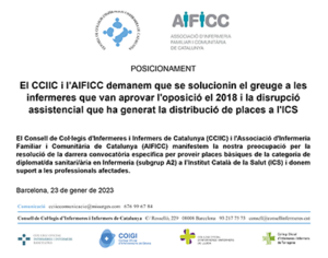 El Consell de Col·legis d’Infermeres i Infermers de Catalunya (CCIIC) i l’Associació d’Infermeria Familiar i Comunitària de Catalunya (AIFICC) manifestem la nostra preocupació per la resolució de la darrera convocatòria específica per proveir places bàsiques de la categoria de diplomat/da sanitari/ària en Infermeria (subgrup A2) a l’Institut Català de la Salut (ICS) i donem suport a les professionals afectades.