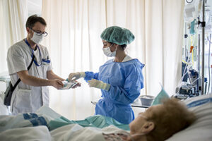 Foto: Infermera prepara el camp estèril per fer un cateterisme venós ecoguiat © Ariadna Creus i Àngel García (Banc d’Imatges Infermeres)