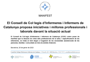 El Consell de Col·legis d’Infermeres i Infermers de Catalunya (CCIIC) volem posar de manifest que la situació de crisi dels professionals de la salut, i específicament de les infermeres, es troba al límit degut a l’augment de les necessitats assistencials de les persones, famílies i comunitats en tots els àmbits d’atenció.