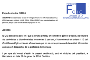 Tal com resolt l’acord de l’expedient (núm. 1/2024), “El CIC considera que, tot i que la tertúlia s’inclou en l’àmbit del gènere d’opinió, no empara als periodistes a difondre dades incorrectes i, per tant, s’han vulnerat els criteris 1 i 2 del Codi Deontològic en fer-se afirmacions que no es corresponen amb la realitat i fomentar així un cert desprestigi de la professió d’infermeria”.