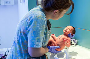 Foto: Llevadora amb nadó © Ariadna Creus i Àngel García (Banc d’Imatges Infermeres)