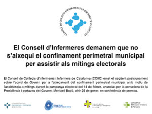El Consell de Col·legis d’Infermeres i Infermers de Catalunya (CCIIC) volem manifestar el nostre desacord amb l’aixecament del confinament perimetral municipal amb motiu de l’assistència a mítings electorals, anunciat ahir, dia 26 de gener, pel Govern de la Generalitat.