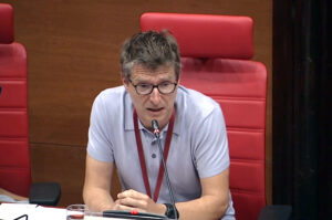 Pere Dalmau, cap d’Infermeria de la Fundació Pere Mata Terres de l’Ebre i professor associat de la Universitat Rovira i Virgili (URV), intervé en la sessió ordinària de la Comissió d’Estudi sobre la Salut Mental i les Addiccions (CESMA) en nom del CCIIC.