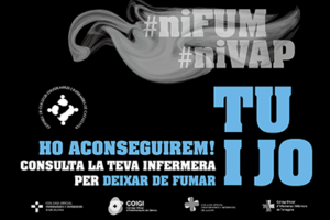 “Tu i jo ho aconseguirem” és el lema amb què el Consell de Col·legis d’Infermeres i Infermers de Catalunya (CCIIC) i els quatre col·legis territorials –COIB, COIGI, COILL i CODITA– insten la població a seguir les teràpies de deshabituació tabàquica que s’ofereixen des de la Xarxa d’Atenció Primària Sense Fum (XAPSF) i la Xarxa Catalana d’Hospitals sense Fum (XCHSF).