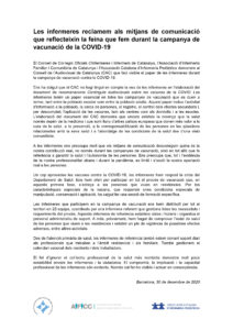 El Consell de Col·legis Oficials d’Infermeres i Infermers de Catalunya, l’Associació d’Infermeria Familiar i Comunitària de Catalunya i l’Associació Catalana d’Infermeria Pediàtrica demanem al Consell de l’Audiovisual de Catalunya (CAC) que faci visible el paper de les infermeres durant la campanya de vacunació contra la COVID-19.