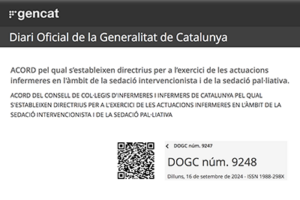 El Diari Oficial de la Generalitat de Catalunya ha publicat l'”Acord del Consell de Col·legis d’Infermeres i Infermers de Catalunya pel qual s’estableixen Directrius per a l’exercici de les actuacions infermeres en l’àmbit de la sedació intervencionista i de la sedació pal·liativa” (DOCG Núm. 9248 – 16.9.2024).