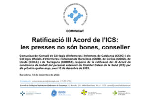 El Consell de Col·legis d’Infermeres i Infermers de Catalunya (CCIIC) i els Col·legis Oficials d’Infermeres i Infermers de Barcelona (COIB), de Girona (COIGI), de Lleida (COILL) i de Tarragona (CODITA), volem manifestar el nostre desacord per la ratificació del III Acord de condicions de treball del personal estatutari de l’Institut Català de la Salut (ICS) per part del Govern de Catalunya, ahir, 12 de desembre de 2023.